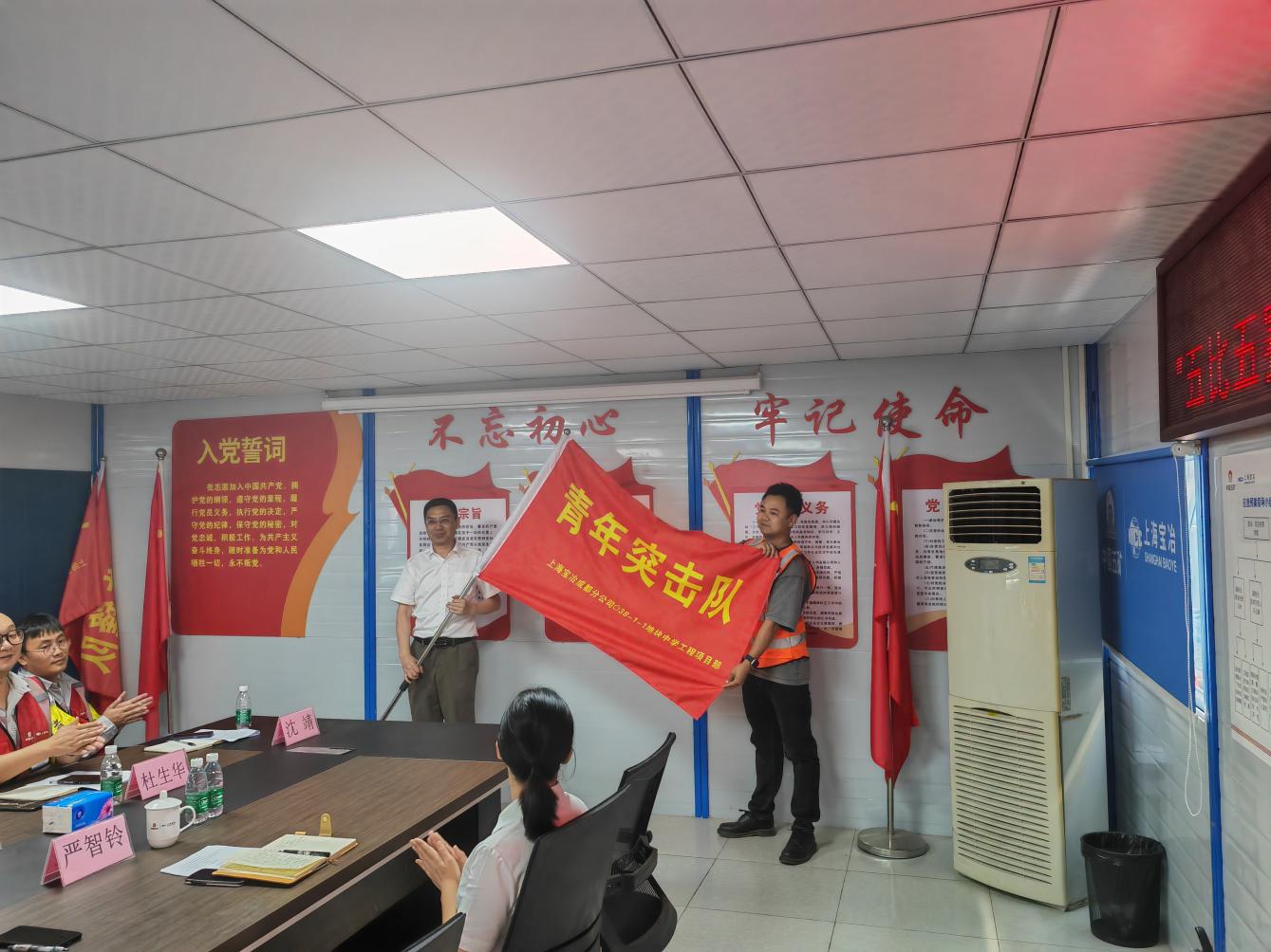 整個(gè)項(xiàng)目施工任務(wù)重、難度大、工期緊。為充分調(diào)動(dòng)全體施工人員的積極性,項(xiàng)目部決定開展“五比五賽五滿意立功競賽暨大三個(gè)月確保 9.30 結(jié)構(gòu)封頂目標(biāo)”勞動(dòng)競賽活動(dòng)。會(huì)議首先由施工單位宣讀“五比五賽五滿意”立功競賽暨大干三個(gè)月確保 9.30 結(jié)構(gòu)封頂實(shí)施方案,再由主攻單位與項(xiàng)目部簽訂勞動(dòng)競賽協(xié)議,后由兩江建設(shè)公司代表萬榮對參建各方安全質(zhì)量方面做出具體要求。最后,由上海寶冶工會(huì)主席陽剛講話并向黨員代表汪林授“黨員先鋒隊(duì)”隊(duì)旗,成都分公司黨委副書記、工會(huì)主席徐晨堯向青年代表鄭睿授“青年突擊隊(duì)”隊(duì)旗。