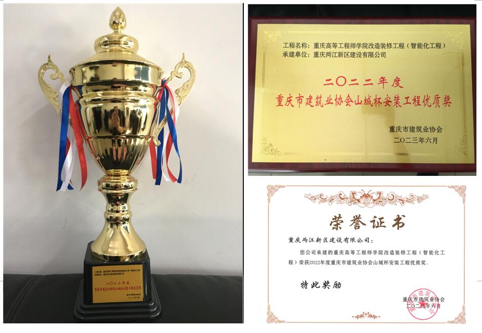 近日,由兩江建設公司承建的重慶高等工程師學院改造裝修工程(智能化工程)榮獲2022年度重慶市安裝工程最高獎項——山城杯安裝工程優質獎。